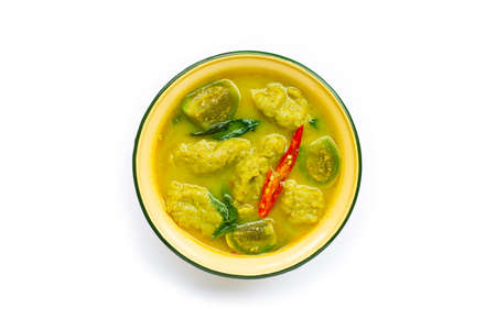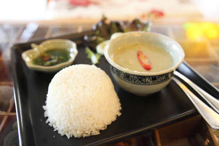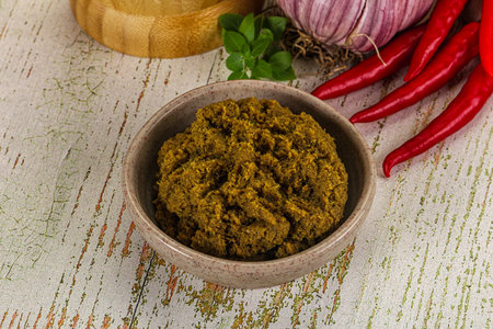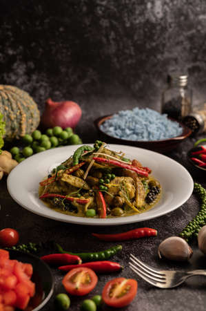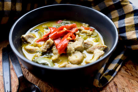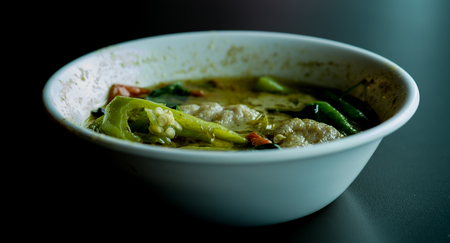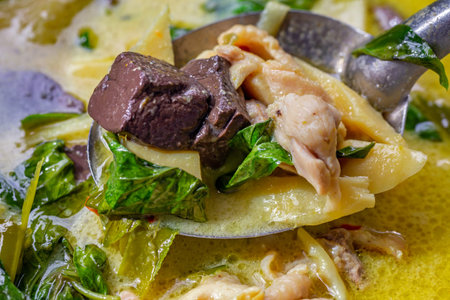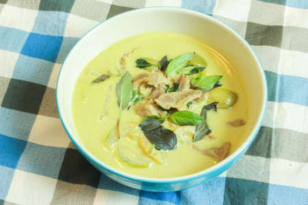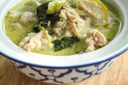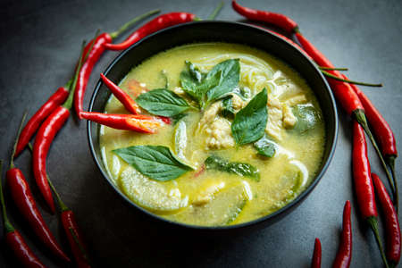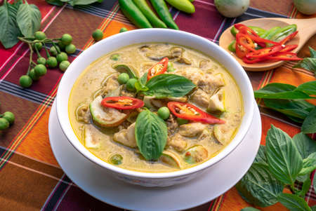 Traditional Thai food green curry and basil leave hot and spicy with chicken and meat on a table