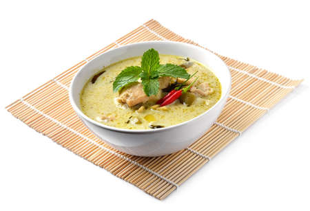 Traditional green Thai chicken curry served in a white bowl with vegetables
