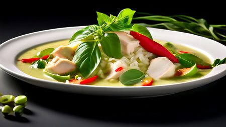 Green Curry (Gaeng Keow Wan): Savor the creamy and fragrant green curry, made with coconut milk, green chilies, and tender chicken or vegetables.Generated with AI