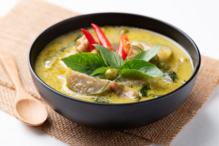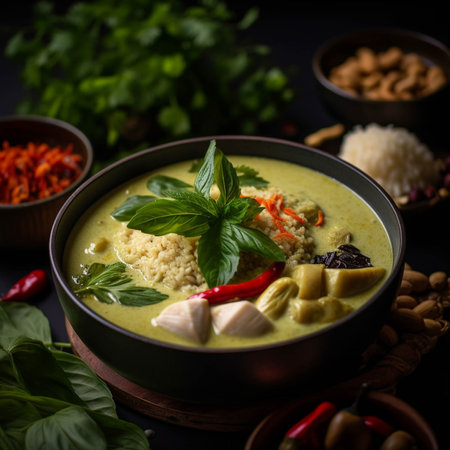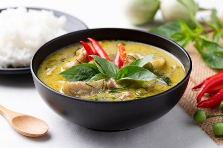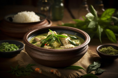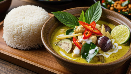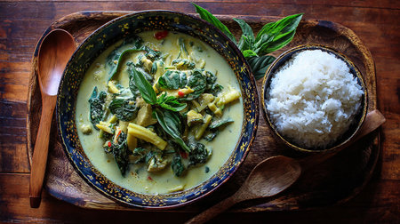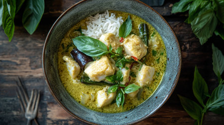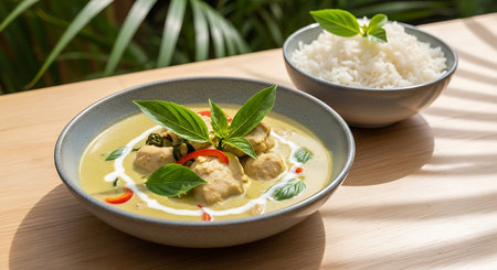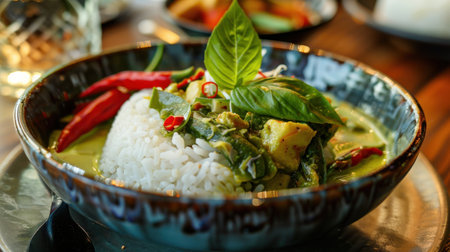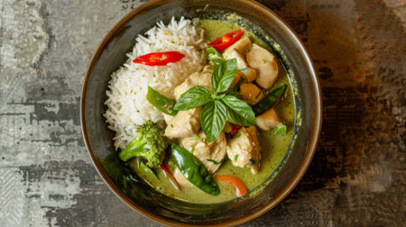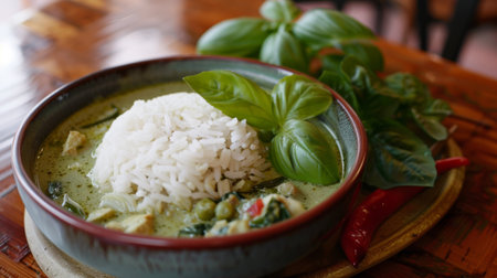 A vibrant Thai green curry served in a traditional bowl, with jasmine rice and fresh basil leaves on the side.