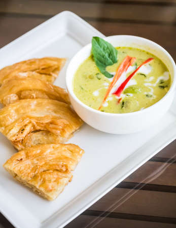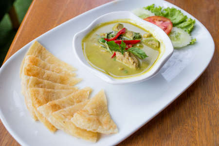 Green curry chicken soup with nan, an Indian-Thai fusion food, on glass top wooden table