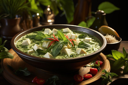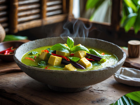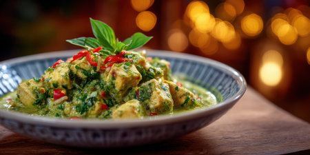 Green curry with tofu and fresh basil leaves served in bowl with vibrant chili slices and creamy sauce, warm bokeh background