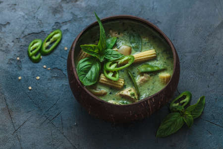 Green curry with coconut milk and fresh basil leaves on wooden background.
