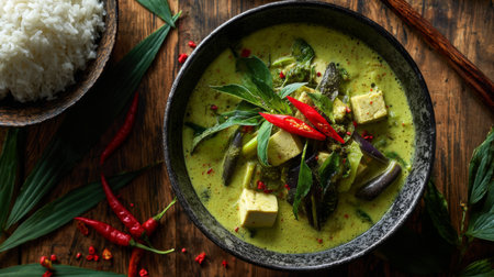 A close-up captures a bowl of vibrant green curry alongside a portion of white rice. The dish showcases fresh vegetables, herbs, and red chili peppers, arranged on a wooden serving tray. The composition, lit with natural light, suggests a restaurant setting, suitable for culinary content or food-related commercial projects.