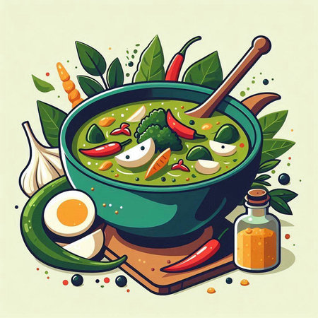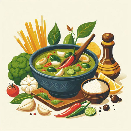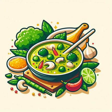 Spicy green curry soup with ingredients. Vector illustration of Thai cuisine.