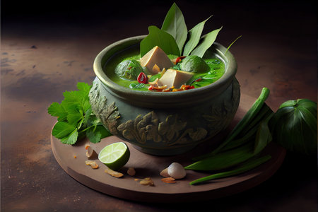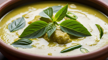 Macro food illustration of a spicy Thai dish, featuring a bowl of vibrant green curry in a bustling street food market. The bold spices and complex flavors of the dish. AI generated