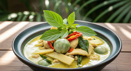 Authentic Green Curry chicken in a vibrant outdoor setting.