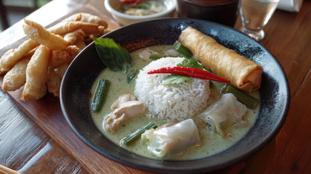 A traditional Thai meal of chicken green curry with bamboo shoots, served with a side of fluffy jasmine rice and crispy fried spring rolls