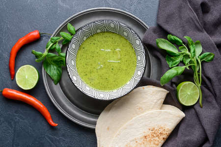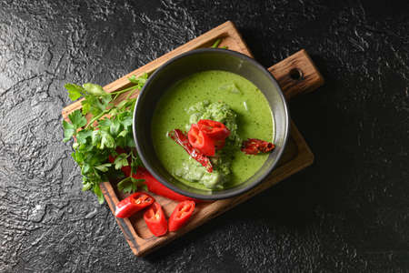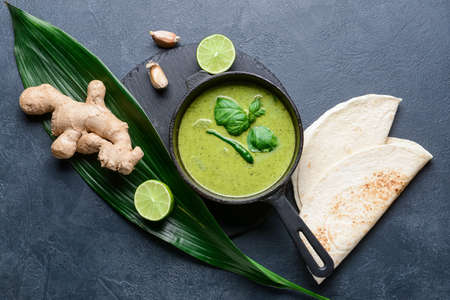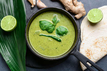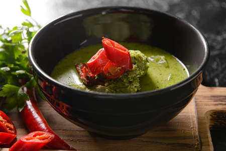Green curry with chicken in bowl on dark background. Traditional Asian food. Top view, flat lay, copy space, panorama