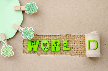World alphabet on recycle paper and leaf wooden clamps. Environment concept.