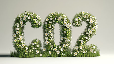 CO2 text formed with grass and flowers on neutral background.