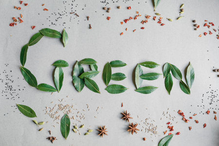 Green word from green leaves and spices on a white background