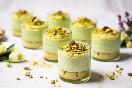 pistachio mousse served in small glass jars lined up, created with generative ai