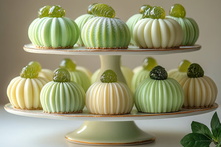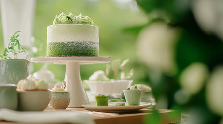 A beautifully crafted green cake displayed on a pedestal, surrounded by elegant treats. Perfect for celebrations and capturing the essence of gourmet desserts.