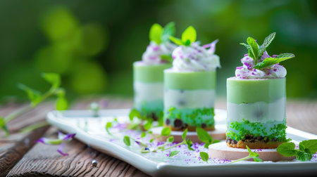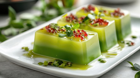 This exquisite green jelly dessert features layers of vibrant flavors, topped with edible garnishes and fresh herbs, perfect for any occasion.