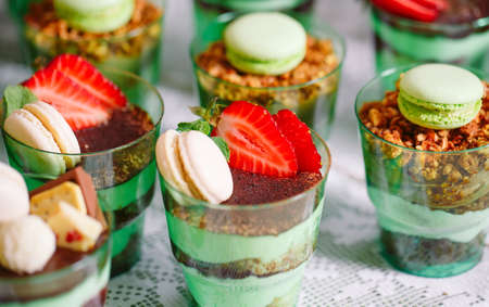 Many servings of sweet tasty dessert on buffet