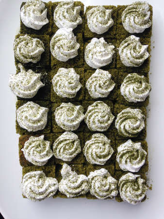 Matcha green tea cake with with cream on top, Top view
