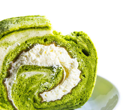 Green tea roll cake on white background