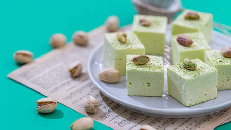 Handmade souffle candy with pistachioon on a bright background. Homemade sweets or candies. Pistachio souffle. Selective focus