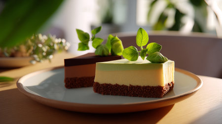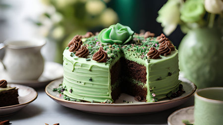 Green tea cake with chocolate, decorated in a white plate on the table.