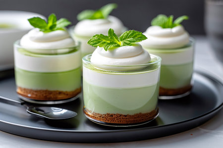 Green tea dessert creamy dessert layered dessert glass cup dessert fresh garnish sweet treat elegant presentation close up food