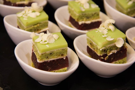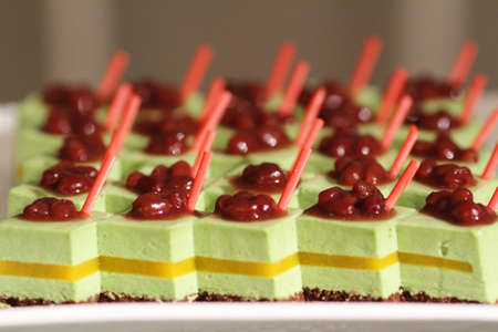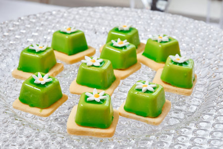 Close up of delicious green jelly cakes on table on sweet wedding buffet. Candy bar.