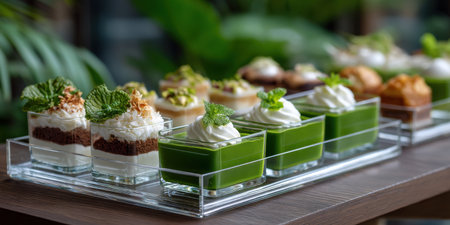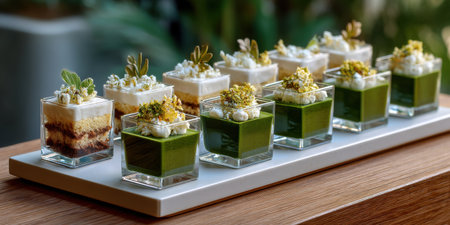 Miniature dessert cups with green matcha and creamy layers topped with whipped cream and decorative herbs arranged wooden tray