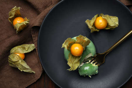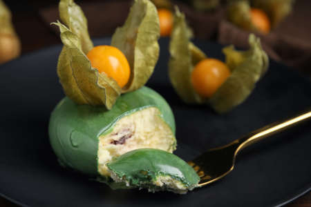 Delicious mousse cake decorated with physalis fruit on black plate, closeup