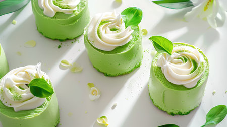 Exquisite matcha cream cakes topped with smooth frosting and fresh green leaves, beautifully arranged on a pristine white background, highlighting their elegance.