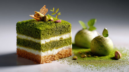 This visually appealing dessert showcases a vibrant green matcha cake layered with creamy filling, garnished with pistachios and mint. A perfect treat!