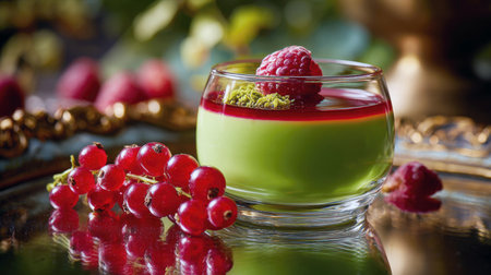 An elegant gourmet dessert featuring smooth green pistachio panna cotta, topped with bright raspberry sauce and fresh red currants. Perfect for fine dining, food blogs, or luxurious menu design.