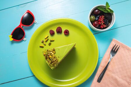 Pistachio mousse cake in the fishing Culinary art. On striped graphic saucers