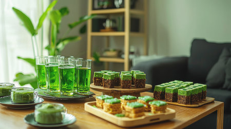 Festive Themed Party with Irish Green Snacks and Drinks in a Cozy Living Room. Concept of Cultural Fusion, Celebration, and Culinary Exploration. St. Patrick's Day.