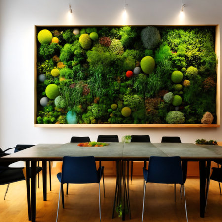 Dining room with a wooden table, gray chairs, and a vertical garden on a green wall