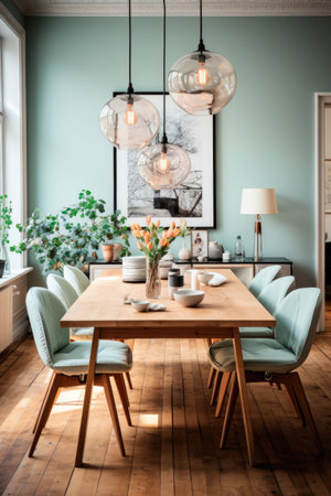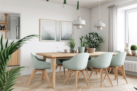 Modern Scandinavian Dining Room With Mint Chairs, Wooden Table, And Green Accents