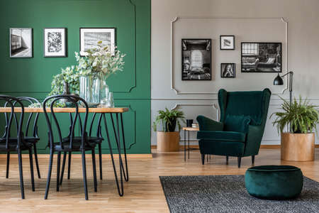 Elegant bottle green dining room with wooden table with black chairs and emerald green armchair and pouf