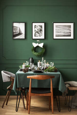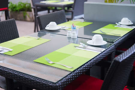Grey and black wooden chairs at round table with green tablecloth,plates, mugs and wine glasses