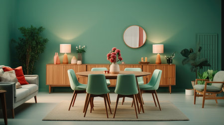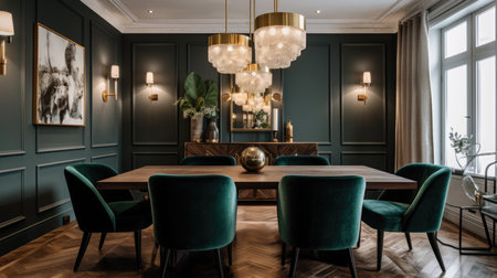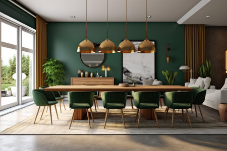 Interior design of modern dining room, wooden table and green chairs. Generative AI