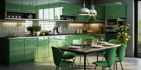 Modern kitchen design in green shades. High quality photo. Generative AI