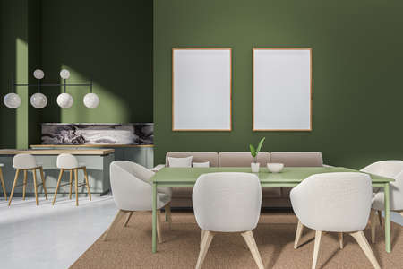 Green kitchen interior with sofa and dining table with chairs, cooking space with bar island and seats, light concrete floor. Two mockup posters. 3D rendering
