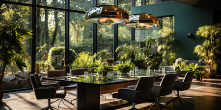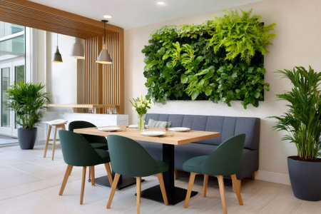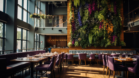 Contemporary restaurant or cafe interior embracing biophilic design with lush living plants
