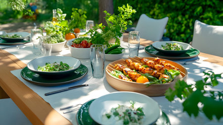 Friends savor a fresh, flavorful meal outdoors, laughing amidst the greenery.