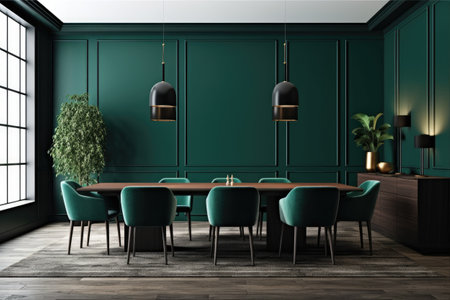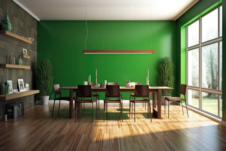 Interior of modern dining room with green walls, wooden floor and long wooden table with chairs. 3d rendering