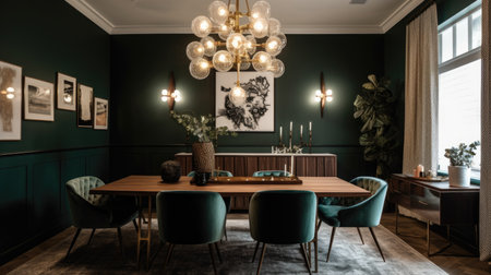 Interior design of Dining Room in Mid-Century Modern style with Chandelier decorated with Velvet, Wood, Brass material. Contemporary architecture. Generative AI AIG24.