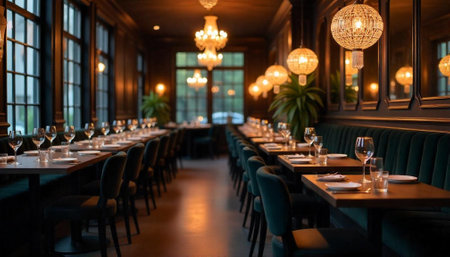 Elegant restaurant interior showcasing tables with wine glasses and plates