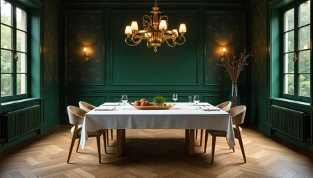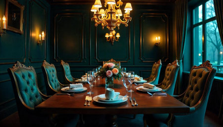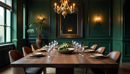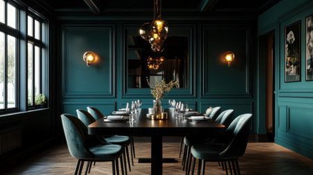 A stylish dining room featuring teal walls, a modern table, and elegant furnishings. The serene atmosphere, complemented by indoor plants and ambient lighting, enhances the inviting space.