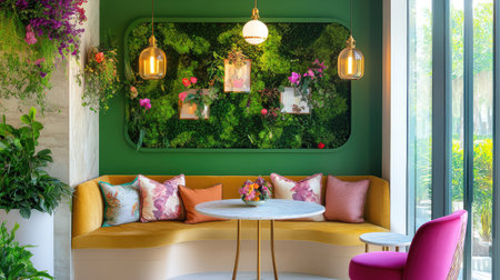 A cozy indoor seating area featuring lush greenery and delicate floral accents, perfect for relaxation and social gatherings in a vibrant atmosphere.