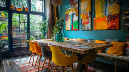eclectic interior design, eclectic dining room featuring vibrant abstract paintings on walls, showcasing funky and fresh interior design