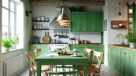 A charming rustic kitchen featuring a wooden dining table, green cabinets, and vintage lighting, creating a welcoming space perfect for family meals and gatherings.