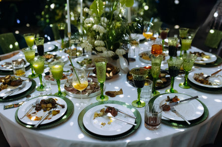 a banquet in a restaurant. Round table with dirty plates, food. glasses, plates, food on round tables
